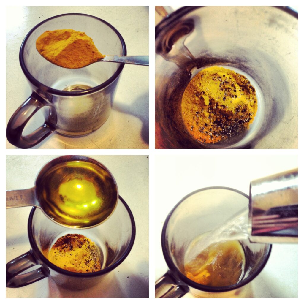 Firstly, put a teaspoon of turmeric powder in a cup, add a dash of freshly cracked pepper, and a dessertspoon of olive oil.